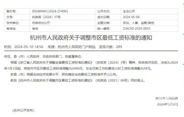 根據《浙江省人民政府關于調整全省最低工資標準的通知》(浙政發〔2024〕3號)精神,結合我市實際,決定從2024年1月1日起,將我市市區月最低工資標準調整為2490元,非全日制工作的最低小時工資標準調整為24元。