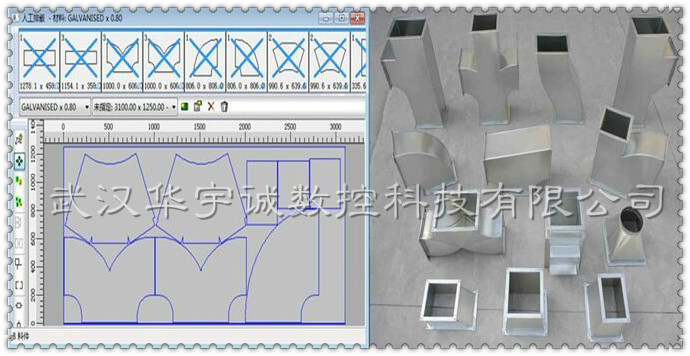 武漢華宇誠數(shù)控生產(chǎn)的通風(fēng)管道數(shù)控等離子切割機(jī),針對風(fēng)管展開切割進(jìn)行了專門優(yōu)化。切割速度更快、切割精度更高、切割效果更好。并搭配專門的風(fēng)管展開軟件,用戶只需選擇要切割的風(fēng)管類型,輸入相應(yīng)尺寸參數(shù),便可自動排料、自動生成加工程序,用戶直接用U盤在切割機(jī)上調(diào)入加工程序切割即可。